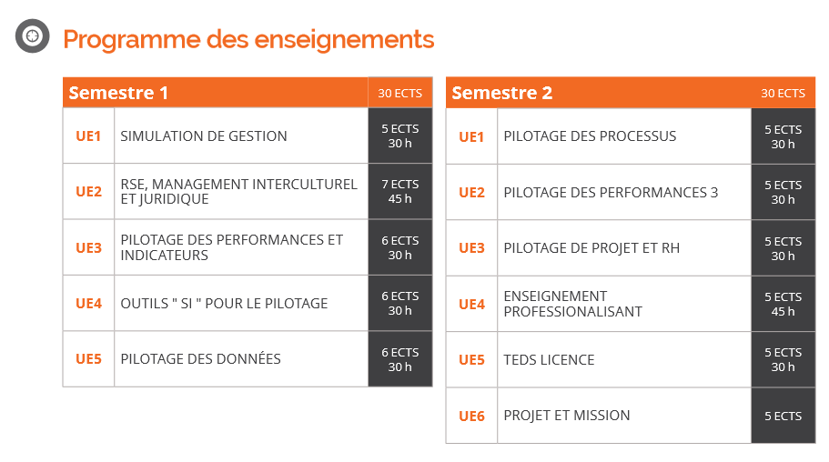 Le premier semestre aborde des disciplines générales de gestion en plus des disciplines liées au contrôle de gestion.